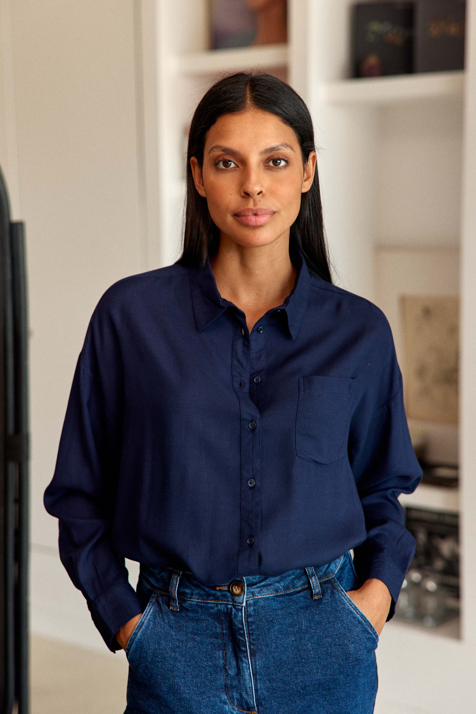 Chanice. le chemisier marine fluide à coupe droite. avec col chemise. manches longues et poche poitrine.