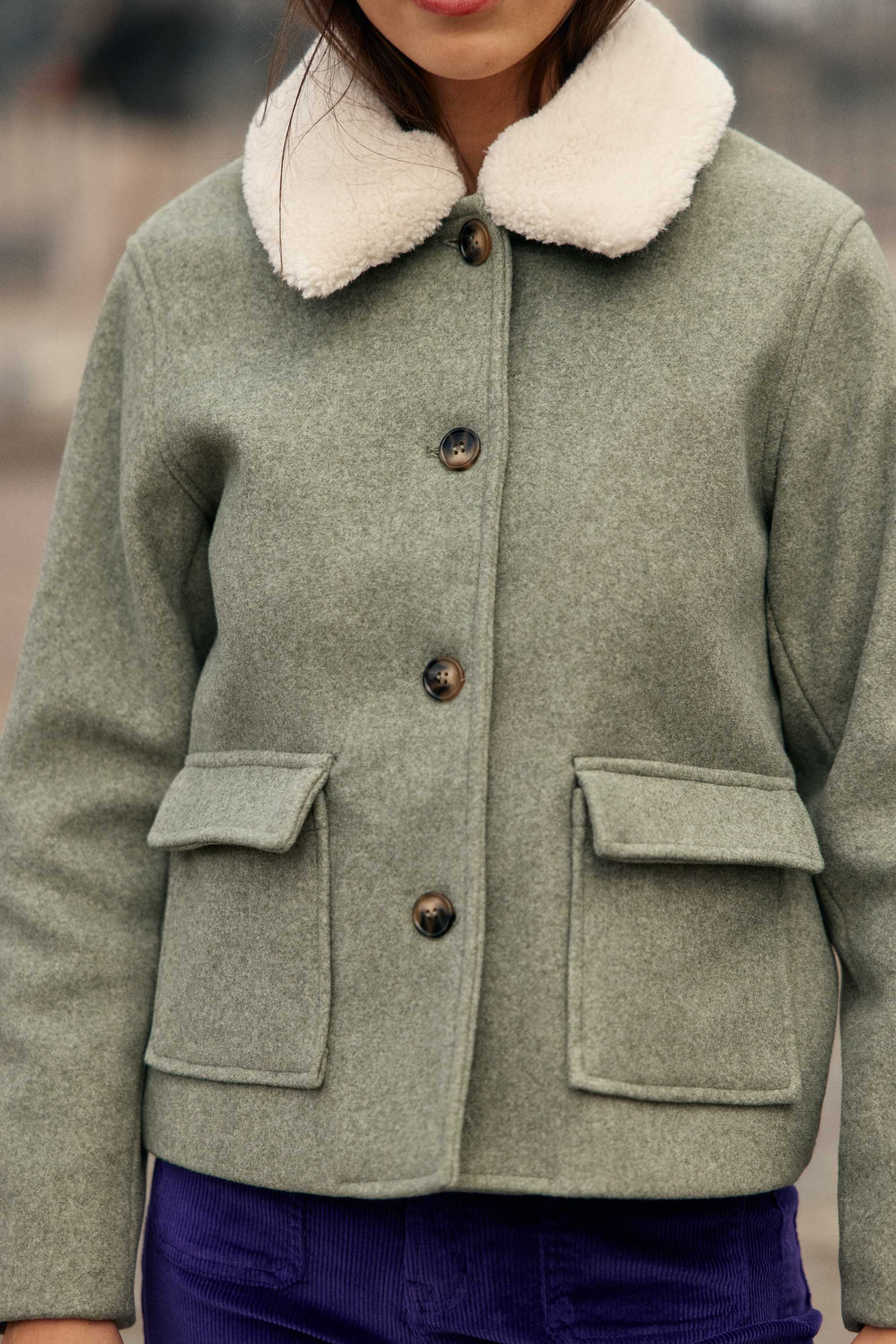 Nattie. le manteau kaki court à coupe droite. avec col chemise et col en fausse fourrure amovible. poches à rabat et fermeture boutonnée.